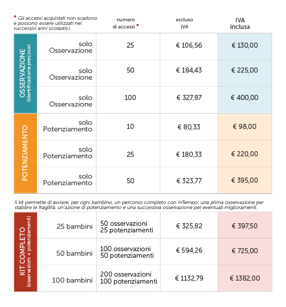 Puoi acquistare dei kit completi che comprendono un percorso integrale con InTempo: una prima osservazione per stabilire le fragilità, un’azione di potenziamento e una successiva osservazione per eventuali miglioramenti.